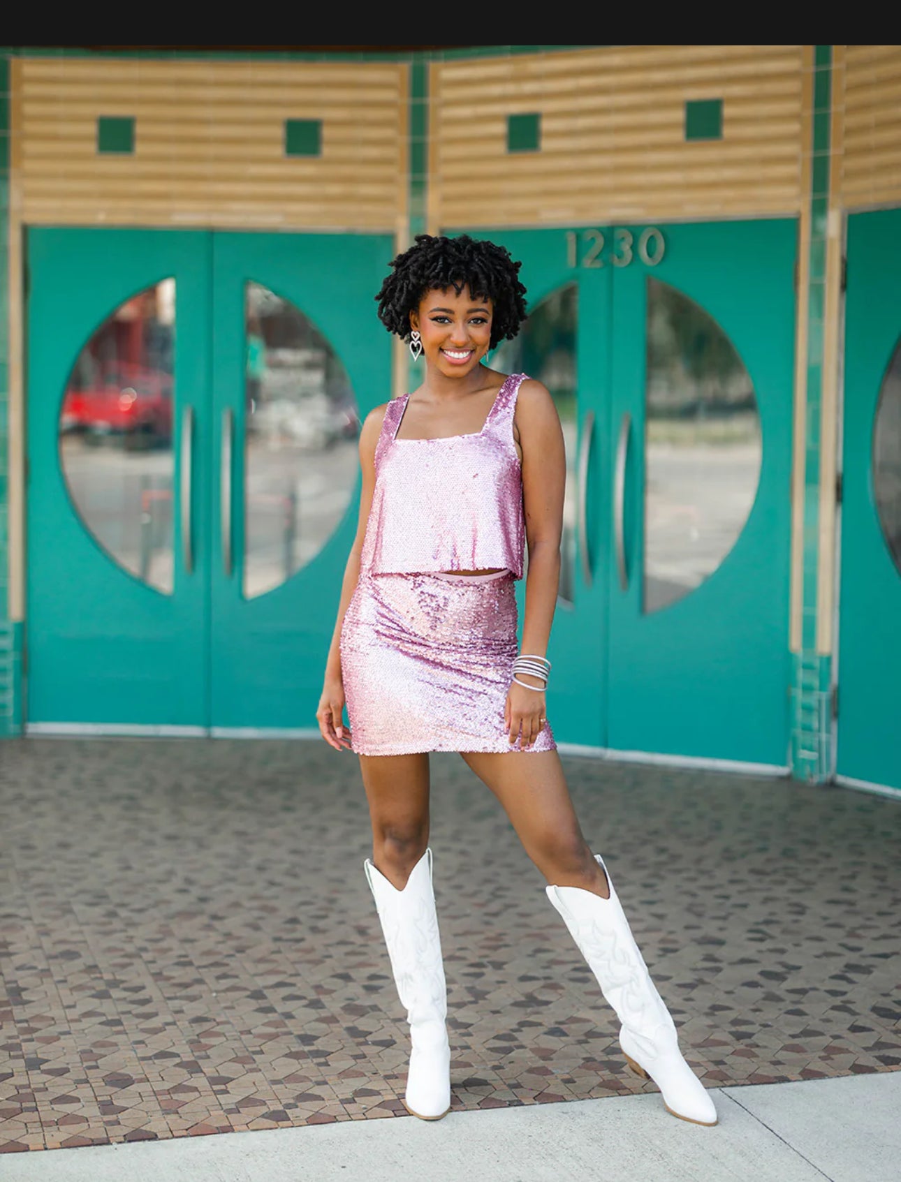 Shake it off in our NEW Sugar set! The Sugar Set features a short sleeve sequin cropped top with button closure and sequin mini skirt with a zipper closure. She's perfect for any party or concert you have!