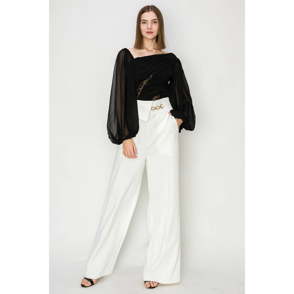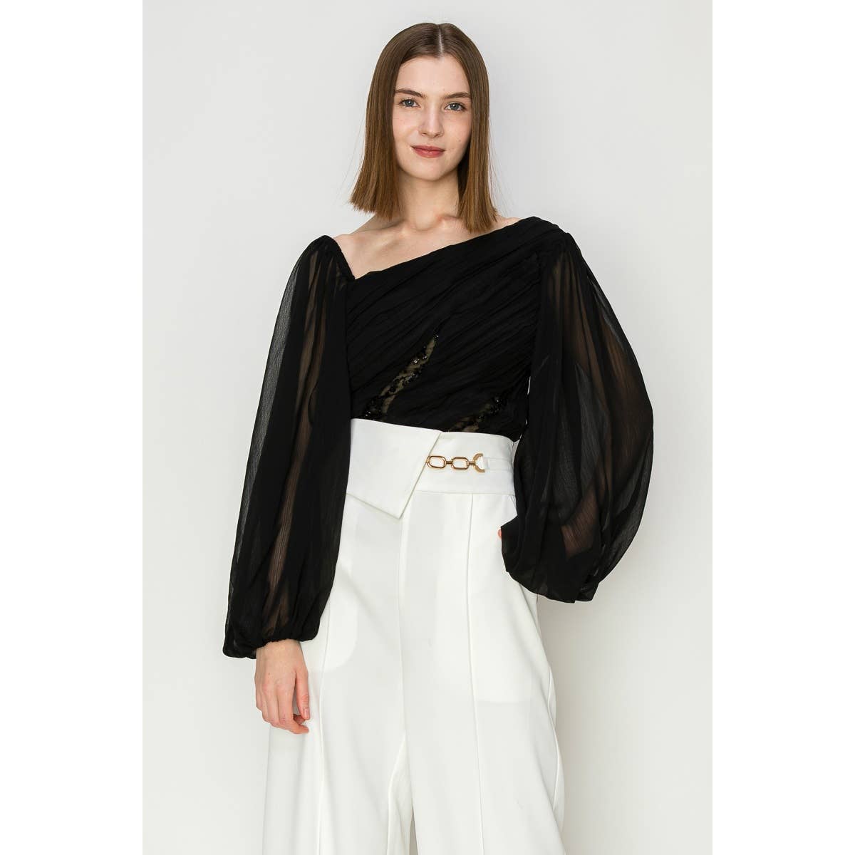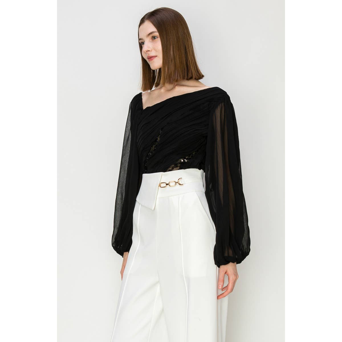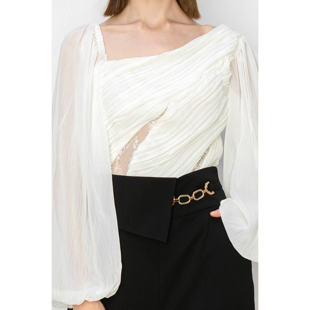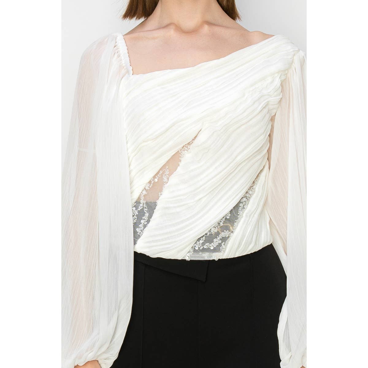 Chiffon Top with lace insets -Asymmetrical neckline -Front sequin detail
